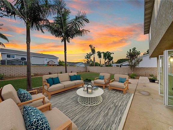 A single-family, 2-story home with 5 bedrooms, 3 bathrooms offering a priceless 1 bedroom and bathroom situated comfortably on the main living level. This lovely home has an expansive and popular open floor plan with a hardwood floor downstairs, a tile kitchen, and carpet in the bedrooms. The living room has a cozy fireplace and opens to a luxurious gourmet kitchen with stainless steel appliances, granite counter tops, and a handsome large island. Natural light filters into the computer work space/desk located in the kitchen allowing a homeowner to work from the comforts of home. The family/dining room exudes charm with French doors that open to the front patio. This home boasts a massive lush grass backyard with plenty of privacy for relaxation and entertaining family and friends--positively pet friendly! Parking is a pleasure on the epoxy floor in a luxurious 3-car garage with ample built-in shelves. The home is located on a large, interior lot within the track and on a cul-de-sac. Saving the best for last... location, location location... 7 whole minutes to the sandy beaches of sunny Southern California; and the "top-rated" elementary, middle and high schools Huntington Beach has to offer!