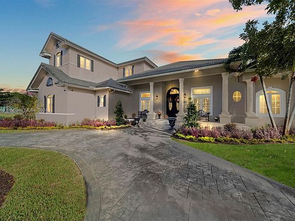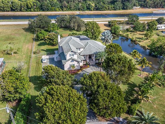 NO HOA. Impressive custom built home in Southwest Ranches for working professional families who love privacy & serenity, & desire easy access to major roads, shops, restaurants, & amenities. It sits on MORE THAN ONE ACRE lot, on a cul-de-sac, & it's waterfront. Its split 4/4 BR has a huge MB & two bonus rooms, an office & lg. exercise/entertainment RM that can be converted to BDRM's by adding a closet. Let the 12 ft. ceilings whisper stories of elegance as you enchant yourself in the enormous family RM, the breakfast nook, & its gorgeous kitchen w/wood cabinets that include an island & peninsula, granite ct, & SS appliances. It boasts many features including impact doors & windows, a screened heated pool & jacuzzi, lg. gazebo & bar area, & more.