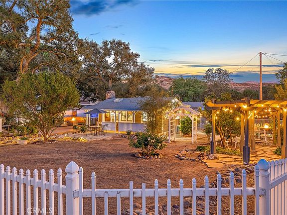 Situated on a spacious, level, double lot, this enchanting country retreat invites you to relax and enjoy life’s simple pleasures. With plenty of room for gardening, pets, and even RV parking, this turnkey home has it all. Inside, the living room features a vaulted ceiling, multiple skylights, wood flooring, a dining area, and a cozy river rock fireplace with a wood-burning stove for maximum heat efficiency. The main bedroom offers tumbled marble flooring, and an attached full bathroom with a large tub and tiled surround. The smaller second bedroom or office showcases a beautiful farmhouse-style barn door and enjoys views of the front yard. The upgraded kitchen includes a garden window overlooking the scenic grounds, granite counters, a stainless refrigerator, an electric stove, and a microwave. Additional amenities include: three new mini-split heat and air units (located in both bedrooms as well as the kitchen), a separate storage garage with washer and dryer, two extra storage rooms ideal for work or hobbies, a relaxing spa, and an expansive custom Trex deck for stargazing evenings. The fully fenced grounds feature a private garden with raised planter beds, ten mature fruit trees ranging from pomegranates to tangerines, meandering brick paths covered in trellises and grapes vines, a stone patio with fire pit seating, and a concrete parking area with an electric gate for added convenience and security. Recent upgrades include dual-pane windows, fire-resistant siding, a tankless water heater, updated electrical, and wired security. Residents of this sought-after community appreciate a variety of neighborhood traditions, including the much-loved Fourth of July parade, as well as access to the community riding arena, O’Neill Park, and miles of scenic trails. Enjoy close proximity to Rose Cantina, the iconic Trabuco Oaks Steakhouse, shopping, and Trabuco Canyon Elementary- all within a top-rated school district. Full of warmth and style, this Trabuco cottage offers canyon living at its finest- come experience the lifestyle you’ve been waiting for.