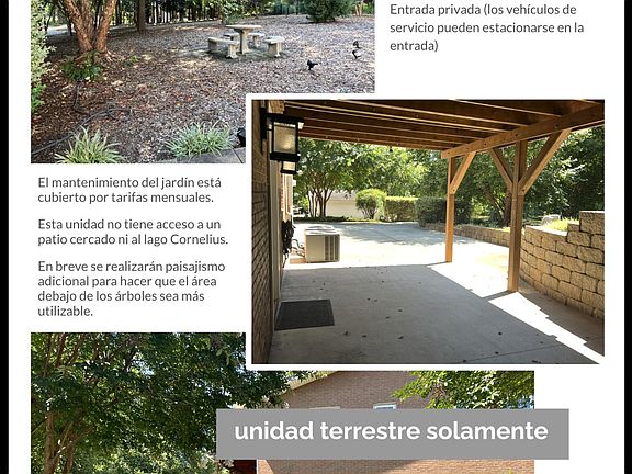 - Exterior features: Amplio lote arbolado., Barrio tranquilo, Brick, Cerca de Cornelius Elementary School, Cerca de Harris Teeter y Food Lion, Cerca de Lake Norman YMCA, Entrada privada, HVAC y electrodomesticos energeticamente eficientes, Heating system: Forced Air