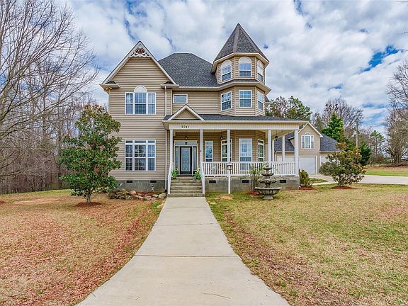 Wonderful Victorian style home has a lot of charm. Porch over porch plan is custom built, has a circular driveway and sits on under five acres in the country away from bustling city life. Enjoy the 10 ft ceilings on the main level, endless windows, beautiful chandeliers, and all the southern living spaces offered! Begin every morning with a cup of Joes from your very own porch access from the primary suite. Primary bath has vaulted ceilings over you garden tub to unwine and end the day. There are two detached garages- one garage that's tucked behind the house has room for 3 cars plus separate living quarters above with 4th bedroom/4th bath/kitchenette and the second garage to use as workshop or store your big toys!