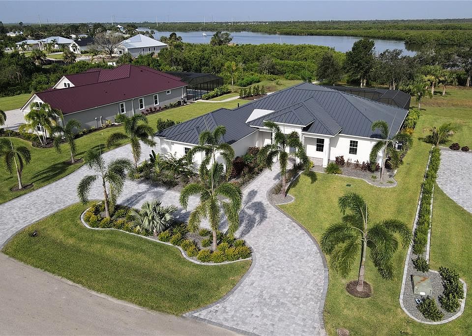 One or more photo(s) has been virtually staged. **PLEASE ENJOY THE 3D INTERACTIVE VIRTUAL TOUR ASSOCIATED WITH THIS FABULOUS PROPERTY – Welcome home to Punta Gorda Florida and the gated community of the Estates on Peace River! Situated on a .92~ acre riverfront parcel, this recently completed custom jewel features over 2780 square feet of air-conditioned living area and enjoys four spacious bedrooms, an office/den, three full baths and a coveted three-car attached garage. Many custom features await, including a neutral decor with a beamed great room ceiling, 2' x 4' tile floors, tray ceilings, crown molding in many rooms, beautiful 8' single-panel doors and 5" base trim. In addition, there is abundant interior storage, wood flooring in all four bedrooms, an efficient propane-fed instant hot water system and dual-zone climate control. With its oversized island, the enviable designer kitchen features stone counters with a decorative backsplash, lovely stainless appliances, stunning solid wood soft-close cabinetry and a concealed custom walk-in pantry! This home has a sought-after open floor plan with a split bedroom layout for privacy. The primary retreat is roomy and boasts an en-suite bathroom with an impressive walk-in shower, a garden tub, and two custom-designed walk-in closets. An oversized palm-lined paver-stone driveway greets you at this home and the pavers adorn the 1400+ square foot rear screened pool enclosure; 610 feet of which is under a tongue & groove ceiling. This area is equipped with a built-in grilling station, a heated saltwater pool with lounging platform and an integrated hot tub...a perfect place to take in your serene river and greenbelt view. This residence has highly efficient PGT impact windows and doors, a 24-gauge metal roof, underground utilities, irrigation well and public water and sewer connections. The Estates on Peace River is a master-planned community comprised of just 28 .9+ acre parcels, each WITH AN ASSIGNED BOAT DOCK and access to the community boat launch and tiki hut pavilion. Architecturally consistent with a modern "coastal" motif, this community offers an old Florida lifestyle while providing ultra-convenient rural living with a modest monthly association fee. The Estates on Peace River has convenient access to all Southwest Florida offers by land or water. From here, you are 1 mile from Charlotte County Emergency Services, 3 miles from shopping, 8 miles from Interstate 75 (exit 164) and 10 miles from historic downtown Punta Gorda and the Punta Gorda Airport (PGD). This is the perfect home in the ideal location! Take a virtual walk-through now by clicking on the link provided, then arrange your in-person visit and experience The Estates on Peace River for yourself! The seller is highly motivated.