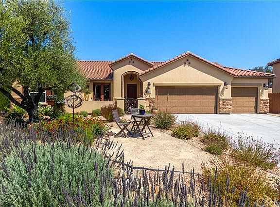 Stunning Single Level Home with Spectacular Views & Breathtaking Yard! Located at the end of a cul-de-sac in one of Paso Robles Wine Country's most sought after neighborhoods is this turn key home resting upon a premium almost 1/2 acre lot! Through the rod iron gate, step into the courtyard to the front door and be prepared to be impressed! Enter to a large picture window w/views of the backyard and olive tree & an open concept floor plan. Dark hand scraped engineered wood floors carry throughout most of the home including the Master Bedroom; & the ceilings in the living and dining rooms are complimented with crown molding. The custom lighting, chef's kitchen w/large island & seating area, + two dining spaces are just a few of the interior amenities that make this property easy to call home. The master suite has a walk-in closet w/custom organizers, dual sinks, and separate soaking tub and shower. There are two additional guest bedrooms with full bathrooms on separate wings of the house. The 3 garage has been finished w/polished concrete floors, and there is even a whole house fan. The real magic happens at night... just wait until you see the view of the twinkling city lights from the comfort of your backyard. The backyard has been HIGHLY upgraded and is truly an entertainer's dream with: 3 fountains, outdoor TV & fan under one of the two covered gazebos, bocce ball court, outdoor kitchen including gas grill & concrete countertop bar with seating, & putting green. A DREAM!