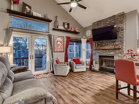 Dream Home with Unbelievable Gourmet Chef's Kitchen, Mountain Views, and Finished Basement with Home Theater! You'll fall in love with the curb appeal the moment you enter the cul-de-sac and see the mature landscaping and modern exterior. As you step inside you are greeted by a one of a kind, lovingly remodeled home with soaring vaulted ceilings. The drop zone at the front of the home keeps you easily organized. The heart of the home is the highly upgraded gourmet chef's kitchen boasting a massive center island with plenty of room for seating and "hidden" electrical for convenience, top of the line soft close cabinetry with crown molding and hardware, designer pendant lighting, stainless steel appliances, sunny bay window, dramatic vaulted ceilings, hidden pantry for storage, and stunning on-trend wide plank flooring. The warm and inviting family room with a floor-to-ceiling stone wood burning fireplace with mantle provides a cozy atmosphere to relax after a long day. This space opens to the stunning walk-out deck with lighted rails and deck under system to keep you dry in inclement weather. Breathtaking west facing mountain views leave you in awe. The whole family will love the home theater that that is perfect for movie nights, binge watching your favorite show, and game days. It features a coffered ceiling with mood lighting, built-in Dolby 11.2 surround sound speaker system, a dry bar perfect for a popcorn station, custom media closet, and easy access to the great back yard with stamped concrete patio. Don't miss the finished storage and doggy hiding space under the stairs! The basement also includes a bedroom with a Murphy Bed making this space easily useable as a home office and a full upgraded bath. Located in a great central Parker neighborhood, this home providing easy access to everything Parker has to offer including the beloved Downtown area, shops, restaurants, and entertainment, and close proximity to all major traffic thoroughfares. This is the one!