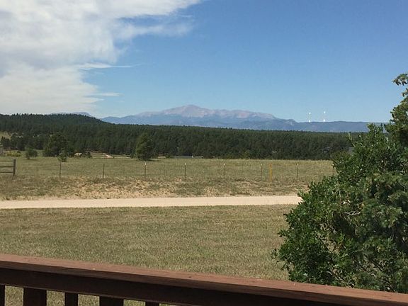 Views, Views, Views! Awesome property on 5 acres with views from every window. The wrap around deck encompasses the whole house plus a private separate deck is off the master suite. The spacious vaulted great room features walls of windows to bring the Pikes Peak and Front Range views and includes a custom Schrader wood burning stove plus a walk-out to deck. The Formal dining room is perfect for family gatherings and the gourmet kitchen features hardwood floors, tons of cabinets, stainless steel appliances a planning desk and a large breakfast nook with hearth area that walks-out to the deck. The main level master retreat features his and hers closets, a walk-out to a private deck, Silhouette Hunter Douglas blinds plus an attached bath with jetted tub. Two additional bedrooms and a full bath complete the main level. Two separate stairways lead to the bright and airy lower garden level family room that has an entrance to the huge oversized 3-car garage with an exterior door.