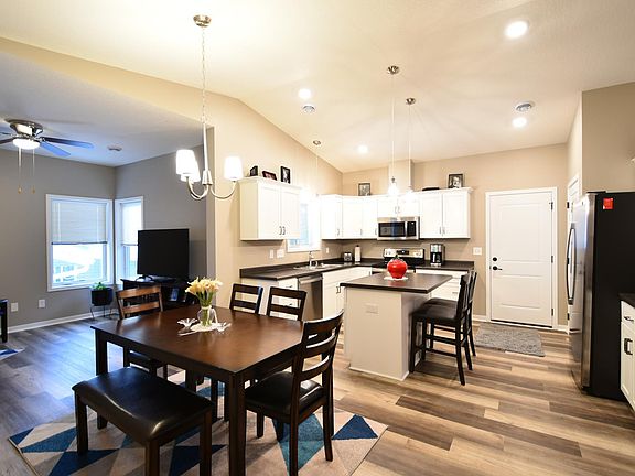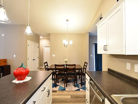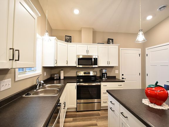 One Level Living, ready for you! Ranch style living with just a couple small steps. This 2-bedroom 2-bathroom townhome features upgraded white painted trim, white kitchen cabinets, LVP flooring, main floor laundry, ample kitchen cabinets with pantry, gas fireplace, sun porch near city park. and owner's suite with private bathroom 3\4 and walk in closet. New water softener, blinds and curtains. Located on a quite end of town and city park located in back yard.