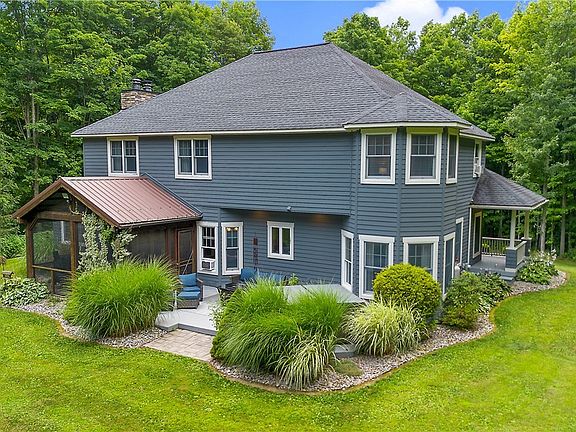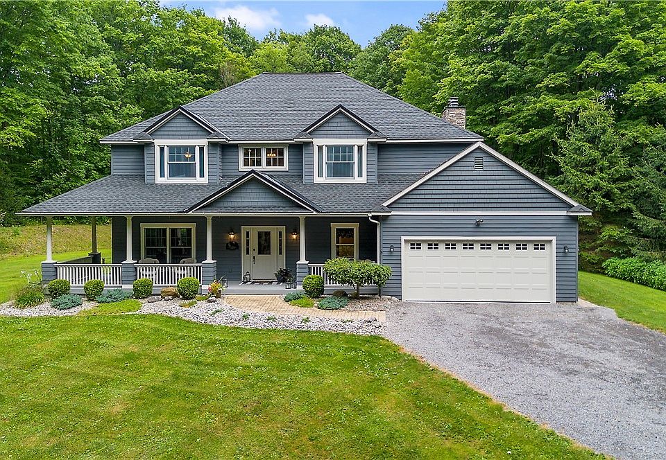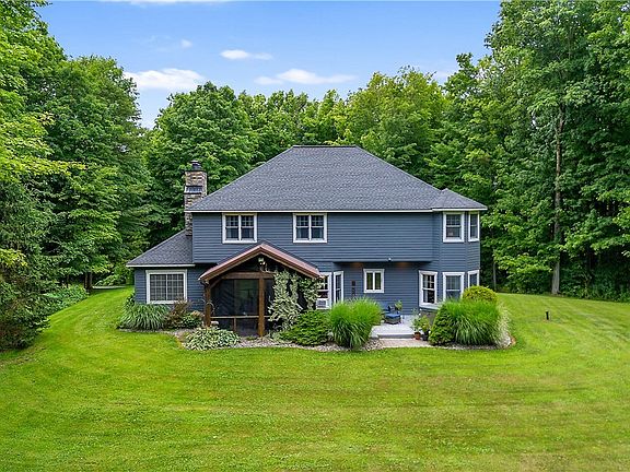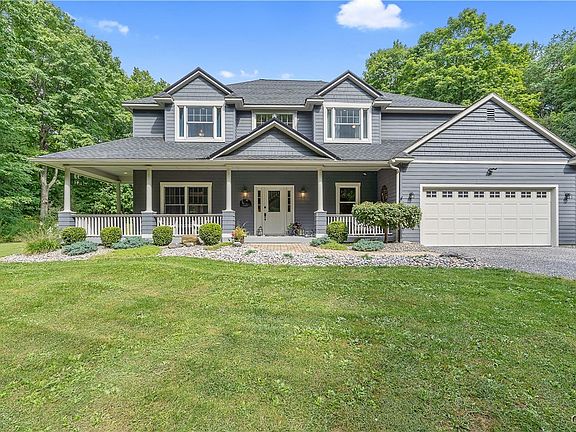Custom-built in 1999, this stunning 2,985 SF colonial home is nestled on 4.24 peaceful acres in the serene countryside, within the Fabius-Pompey School District. Offering 4 bedrooms and 2.5 bathrooms, this private retreat is just 20 minutes from Syracuse, NY. The open floor plan showcases a spacious, inviting kitchen, perfect for entertaining, that seamlessly flows into the living areas. A favorite feature is the charming wrap-around front porch, ideal for enjoying the peaceful, park-like views. Inside, you'll appreciate the convenience of a dedicated office, mudroom, and a screened back porch, along with an expansive back deck complete with a hot tub. The primary suite boasts a walk-in closet and a luxurious bathroom. The finished game room with a custom-made bar offers ample space to unwind. Gorgeous hardwood floors run throughout the home, adding warmth and elegance. The exterior features a newer roof and a 30' x 40' pole barn. This property is a rare find, offering the perfect blend of comfortable country living with modern amenities. (Public records indicate 2,425 SF; the property was recently measured.) Don’t miss the opportunity to experience this one-of-a-kind home today!