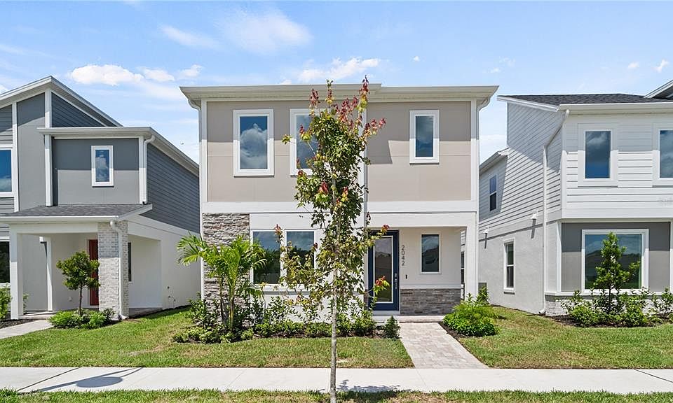 This brand new construction, two-story home (The Ambersweet) is a showstopper with the Contemporary exterior elevation. The home features 3 bedrooms, 2 full bathrooms, a powder room, and flex space all at 1,727 sq.ft. of living space. As you enter this home through the 8ft glass entry door, you are welcome with an open spacious foyer with immediate access to your study and a powder room with extra linen space. As you continue on you will find 12x24 ceramic tile flooring that leads you to the open-concept living room, dining room, and kitchen that's great for entertaining with a spacious eat-in island, a combination cooktop range, and a microwave all surrounded by quartz countertops and grey cabinets with a walk-in pantry featuring a sliding barn door. From the dining area access your spacious exterior extended covered lanai and two car garage. Moving to the second level, you have a split-level layout with the secondary bedrooms and guest bath on one end and the generously sized primary suite on the other end that accesses your private bathroom with a glass-enclosed free-standing shower, dual vanities, linen space and the water closet. Nearby to the primary suite is your walk-in laundry room. Trinity Place offers amenities, including a future Resort Style Community Pool with a Cabana Bath, a Tot Lot Playground, a Dog Park, recreational green space, and sidewalk trails throughout. Conveniently located near Downtown Saint Cloud, a Central Florida gem, you're just a short drive from Lake Nona Medical City, NeoCity, the up-and-coming SunBridge, and a stone's throw from Lakefront Park on the southern shore of East Lake Toho. Historic Downtown Saint Cloud, with its year-round festivals, shops, restaurants, parks, and excellent Osceola County Public Schools makes Trinity Place an excellent place to call home.