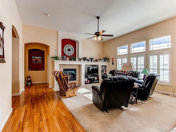 Fantastic large Ranch plan that sits at the end of a cul-de-sac. This private yard backs to Ridgeline open Space with miles of trails and incredible views! Over 4,000 square feet finished. Here are some of the special features you will love: Real hardwood floors though out the main level*Gourmet Kitchen with double ovens,Stainless Steel appliances,gas stove, and a walk in pantry. A large kitchen island and beautiful Corian Counters surrounded by 42 inch Maple cabinets*Plantation shutters*Professionally landscaped*Main floor laundry room with washer and dryer included*The basement features a separate Laundry hook up also*High ceilings with coffered ceilings in several areas.Main Floor Master suite with huge walk in closet*The basement could be a separate living space with large wet bar, bedroom, office and Home Theater room*Transom windows*Large fireplace in the family room that overlooks the open space*Hardiplank siding and Cement Tile roof*You will enjoy the private back yard with covered Patio* This is why you moved to Colorado, now enjoy living here!