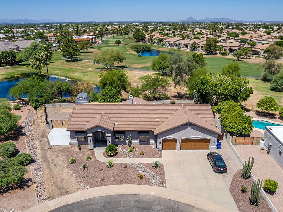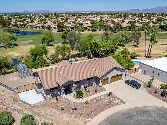 Tucked away on a cul-de-sac lot with no HOA. This beautiful custom home sits on a large lot overlooking the 18th hole at Painted Mountain. Pond with water feature behind. Oversized 3 car garage + RV parking. Enjoy the split floor plan with primary suite & expansive bath + large soaking tub and big walk in shower. Extra large closets. 8 ft glass doors to 2nd covered patio. Chef's kitchen with granite tops and oh my, the view from the large window and bay windows in dining area! 10 ft. volume ceilings throughout, 12 ft glass doors to back from great room. This property boasts 3 bedrooms, office and a huge laundry room/office too. Beautiful hall bath with step in shower and tub splits 2 bedrooms. No golf balls here as the home sits privately off the fairway. Low maintenance yards. And Tuff shed is 10 x 12 for extra storage. Newer sunscreens for every window included. Custom window coverings throughout including electric shades in dining room bay. 3 car garage has newer insulated doors and affords room for your toys. There is a full wall of cabinets too. Built-in workbench as well. Water softener and more storage on side of garage. SimpliSafe security system. New LVP flooring in all rooms T/O except office and laundry room/office. 8 ft. entry door and all exterior doors for added light and bright living. Even the secondary bedroom includes a walkout to 2nd covered patio. Double frenchdoors from primary bedroom to patio. This home is a perfect lock and leave. Entire yard has just been sprayed with pre-emergence with one year warranty. Above ground spa is "as is".