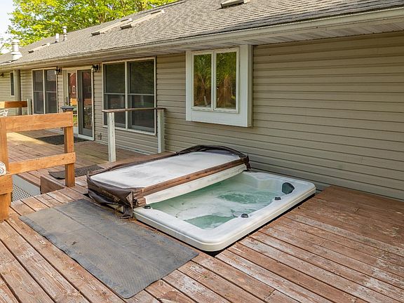 Stunning ranch home in desirable Door Village. Start your day on the front porch or back patio and end your day in the step-down, 4-person hot tub. Through the front door, you'll walk into a split living area space separated by a double-faced fireplace suited for a living room and a dining room. The open concept kitchen has updated counters and appliances and looks onto the .62 acre property. Main floor laundry, 3 bedrooms and 2 full bathrooms are all situated on the main level. The mostly finished basement offers a wet bar, living space, and 2 additional rooms great for bedrooms, offices, or gym areas. This home offers a newer roof, newly refinished deck, Kinetico system, a newer Iron Breaker.