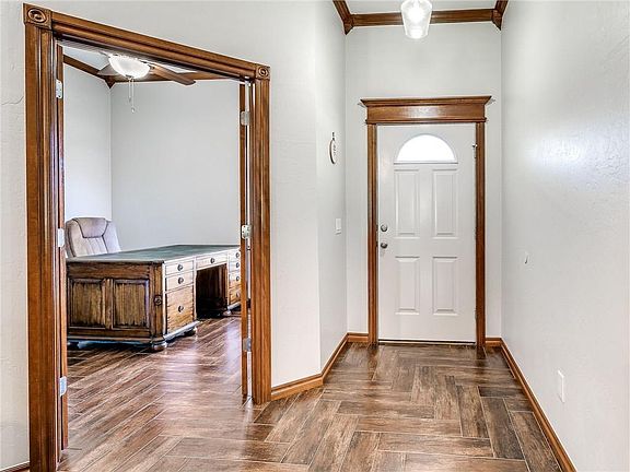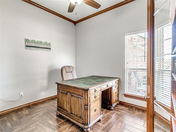 Immaculately maintained home w/ rare 3 car garage in sought after AMD Oakwood East Royale neighborhood. This home has beautiful herringbone pattern wood look tile throughout w/ no carpet. Enter the home to see the executive study to the right and the sprawling & open living room straight ahead wired for surround. Kitchen has ample counter and cabinet space as well as a large dining area. Enjoy the updated master spa w/ onyx double vanities, walk in shower & jetted tub tub surround. Tons of storage in the wrap around Australian closet. Experience privacy w/ a split floor plan and house is recently painted throughout the interior. Storm Shelter in Garage. Large covered patio wired for surround sound, sprinkler system and full gutters. Oakwood East community boasts ponds with fishing and ducks, trails, playgrounds, tables and pavilion.