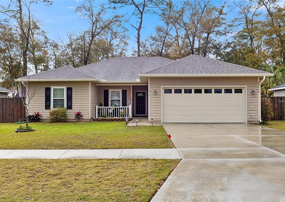 Welcome to Ashton Ridge! This beautiful 3-bedroom, 2-bathroom home with attached garage and fenced in backyard is close to our shopping amenities, the springs, and right off of 441, giving you easy drive North or South! Rest easy knowing this home is only six years old! Upon entering, you'll be greeted by an open concept living, perfect for relaxing or entertaining guests. The modern kitchen is a chef's delight, with large island, granite countertops, stainless steel appliances, soft close cabinets and drawers, and ample storage for all your culinary essentials. The primary suite is a wonderful retreat complete with a en-suite bathroom featuring dual sinks, a water closet, granite countertops, large walk-in shower, and a spacious walk-in closet. On the other side of the home, you will find the two additional bedrooms and full bathroom. To top it all off, no carpet! Step outside to your private backyard where you can relax on your back porch or enjoy a fire on the cool winter evenings. Attached garage has additional built-in storage and even more in the attic above! Come see it for yourself!