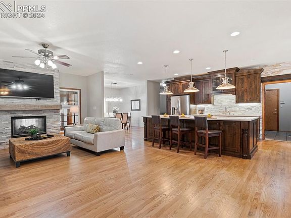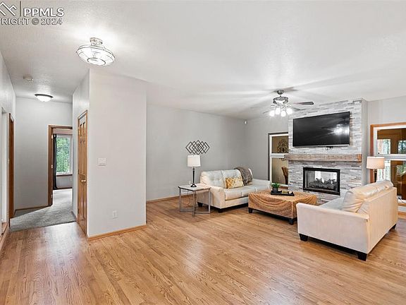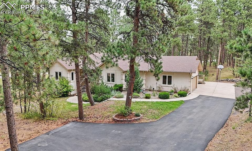 Stunning custom home poised on 2.95 acres in Hawk Ridge offering towering pine trees and privacy. This home boasts true main level living and provides FOUR bedrooms on the main level. Gleaming hardwood floors draw you into the great room featuring a stacked stone fireplace. The beautifully remodeled kitchen offers quartz counters, knotty alder cabinets, gas range, island with breakfast bar, dining nook, and spacious pantry. The kitchen is adjacent to the formal dining room and overlooks the great room - ideal for entertaining. The sunroom is a perfect office, music room or reading room. The master retreat features a 5-piece bathroom, walk-in closet and walks out to a private deck. Three secondary bedrooms on the main floor and full bathroom provide plenty of space to comfortably host family and friends. The lower level is crafted for entertainment and opens to a spacious family room with billiards area. Host Movie Night in the home theater room. Two bedrooms, full bath, and storage room complete the basement. Unwind on the deck and take in the serenity of this property. This home is conveniently located to District 38 schools. The location offers the best of both worlds – a private oasis with easy access to the essentials of everyday life. The driveway was paved in 2022. Don't miss the opportunity to make this beautiful home your own, where you can relish the natural beauty of Colorado.