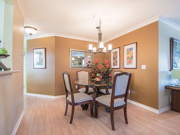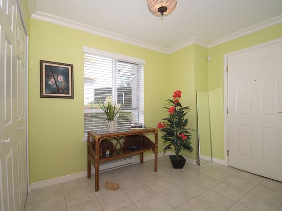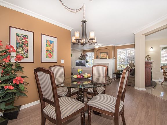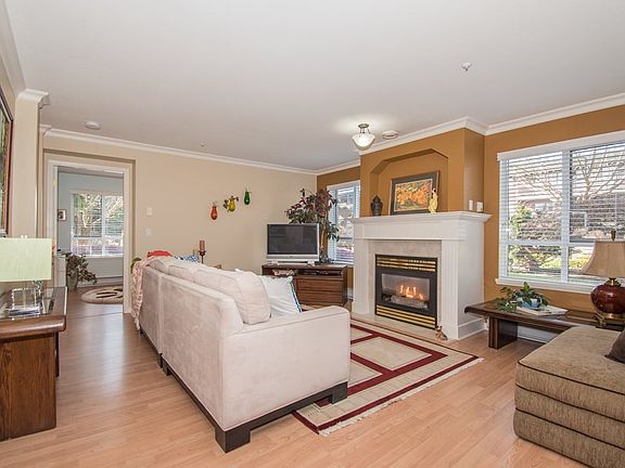 Welcome home to this luxurious, one of a kind, ground floor corner unit with three sides exposed to green space which truly feels like a house. Large foyer invites you into a separate dining rm and cozy living rm with gas fireplace included in strata fees. Upgraded kitchen, with eating area, has new cabinets, organizers, top of the line appliances and under mount lighting. Master bdrm is spacious with 4 piece ensuite and walk in closet. Features include: new spa like shower, security system & bars in bdrms, crown moldings, new modern light fixtures, newer laminate flooring & 2" blinds throughout. Extensive wrap around patio with new retractable glass solarium. Lots of space for entertaining and gardening. 19+ adult oriented complex very close to all types of amenities and transportation.