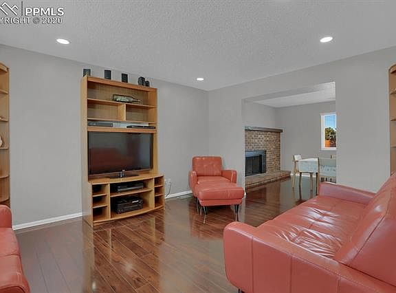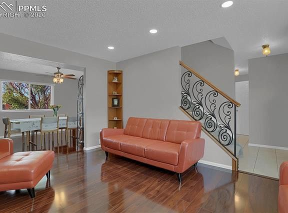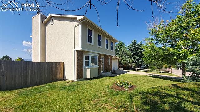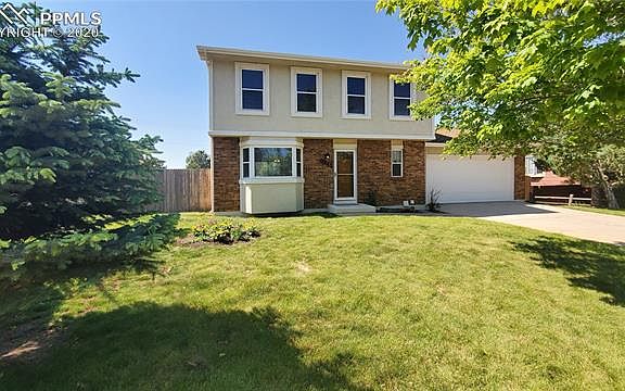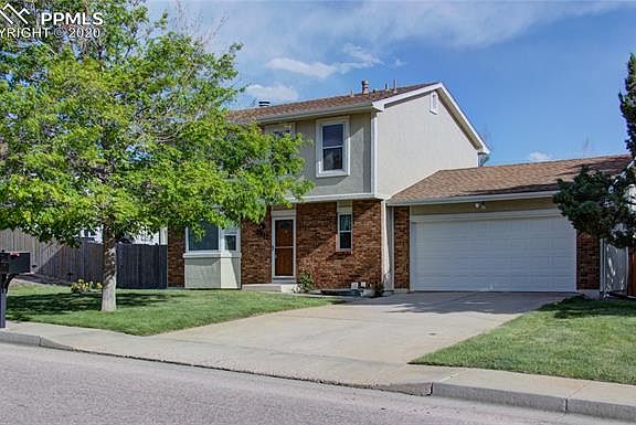 A lovely stucco 2-story Colonial with finished basement located in Academy School District 20. Close to shopping and schools and a view of Pikes Peak Mountain. The customized kitchen features quartz countertops w/Blanco Cinder double sink, ample cabinetry and counter space, soft closing retractable drawers, pullouts, lazy Suzan, and built in spice racks. All kitchen appliances are included. Laminate hardwood and tile flooring on main level. New carpeting (installed 10/19) on upper level and in the basement. The basement features include three storage closets/areas, rec room, T.V. area and a bath rough-in for future growth. The living room, with bay window brightens the Family room that connects with the kitchen features a wood burning fireplace w/mantle. This area could also be used as a super dining area for large family gatherings. Laundry (with electric dryer hookup) is on the main level, with shelving and cabinets. Main level half bath with granite countertop and tile flooring. Upper level master bedroom includes a sitting area with double closets, updated 3/4 bath with granite counters and lovely shower tile. The two additional bedrooms on upper level include full bath with deep soaking tub/shower with custom tile work, newer toilet, and granite counters. The updated K&H vinyl windows with lifetime transferrable warranty are throughout the house. The front entry doors were replaced. The 9,365 sq ft lot offers plenty of room to garden, play, BBQ in the large lot with Pikes Peak views, a 10'x10' wooden deck, and a 35'x13' concrete patio. Air conditioning for those 'balmy' CO summer days. Auto Sprinkler system. 10'x8' Tuff shed. This home has been well cared for. Don't miss this one. It's a keeper...