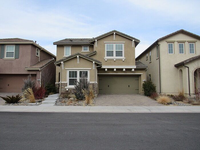 4 Bedrooms, 3 Bathrooms, 2 Car Garage. Rent $2800, Deposit $2790. 1,979 sq. ft. Includes Fridge, W/D, D/W, gas range, microwaves, A/C and double pane windows. Two pets 40 lbs. or less upon approval with an additional deposit of $500 per pet. THIS 3-YEAR OLD HOME IS BETTER THAN NEW! It is a 2-story home with stucco/rock siding and a paver patio that has great curb appeal along with 4 bedrooms and 3 baths that is located in the new and very desirable community of Cyan in the Double Diamond are of Southeast Reno. One of the bedrooms with an adjacent full bath is downstairs and would be prefect as an office, guest quarters, teen quarters or mother-in-law quarters. You enter into a very dramatic entry way with a 2-story high ceiling. In the kitchen you will find granite slab counter tops, lots of upgraded cabinets, stainless steel appliances, an extra-large island with a sink, a breakfast bar, a pantry and an informal dining area that opens to a great room with a ceiling fan in this very open floor plan. All of the bedrooms, especially the master with a ceiling fan, are large as is the master bathroom that has a raised vanity with his & hers sinks, a garden tub, a separate shower plus a good-sized walk-in closet. Other features include lots of 18 inch tile flooring that is located in the entry, kitchen, informal dining area, all 3 bathrooms and the laundry room; 2-tone paint throughout; high ceilings throughout; 2 inch faux wood blinds throughout; a large utility room with lots of counter space and loads of cabinet space that is located upstairs with 3 of the bedrooms; utility saving dual zoned heating and air; lots of oversized light-giving windows; views of the Sierra's from the 2 secondary bedrooms upstairs one which also has a ceiling fan and the other that has a walk-in closet and an oversized 2 car garage with a raised storage rack. Out back you will find a huge paver stone patio bordered by rock and plants. As for location you are within walking distance of Cyan Park that will be a 14-acre park built in 3 phases with the first phase already built out plus you are within blocks of the Southeast Connector and only minutes form The Summit Mall, other great shopping, restaurants, Virginia City, Mt. Rose Ski Resort and Lake Tahoe while still being just minutes from downtown Reno via the 395 freeway. Landscaping is tenant responsibility. Tenant pays G, E, W, T and S. 1 year lease. Contact us to schedule a showing.