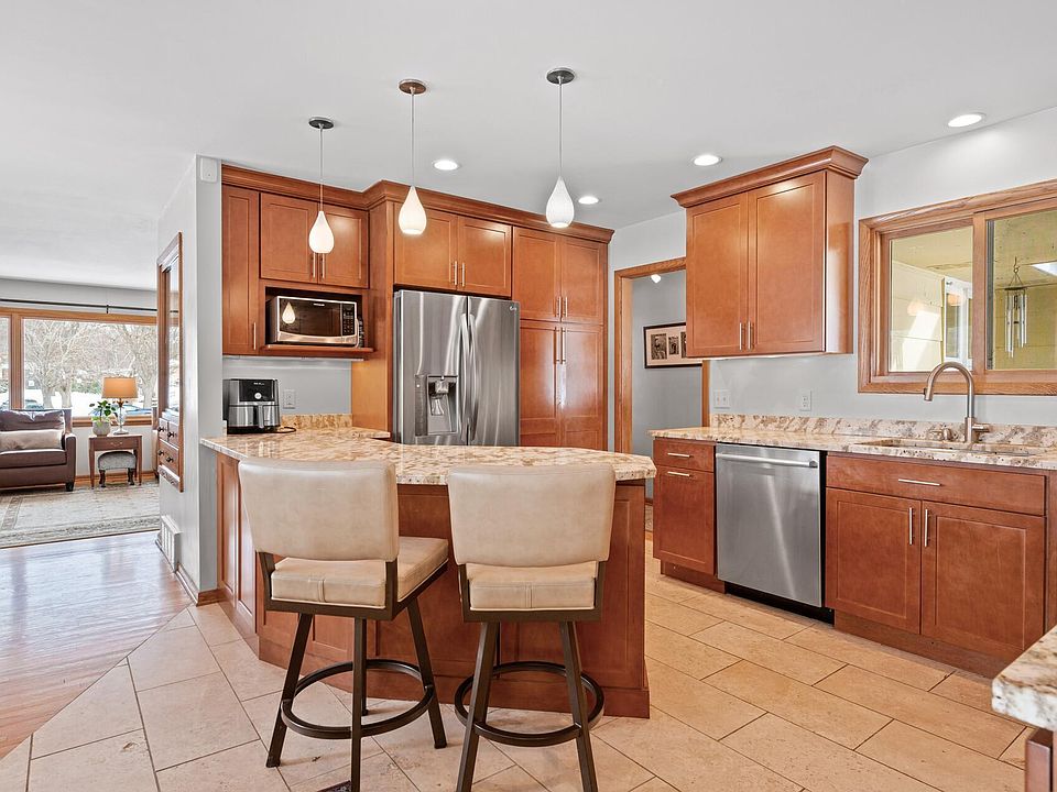 Have you been searching for a nicely updated home on nearly a 1/2 acre lot with a fully fenced backyard & close to everything? This is it! The gourmet eat-in kitchen features a large peninsula, dual fuel range (gas burner/electric oven), vent-a-hood, granite countertops, plenty of cabinetry and opens to the dining and living spaces! Enjoy relaxing in front of the gas fireplace and the view from the large picture window in the living space. You will appreciate the convenience of having 3 bedrooms on one level. The primary bedroom has a gorgeous bay window and private 3/4 bath. The main full bath features a double vanity, soaking tub and tile surround on the main level. The lower level has a great family room/additional office/ work-out space and and has tons of storage and an additional 1/2 bath. Walk to Wesley Park, Golden Valley Country Club, Wildwood Park Pickle Ball Court and drive downtown in less than 10 minutes. Coffee shop, brewhouse and restaurants within 5 minutes!