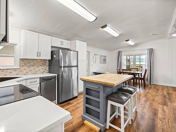 Completely remodeled from the ground up in 2022, this 2-bedroom, 2-bath double-wide home feels like brand new-at a fraction of the price! Designed with a modern, open floor plan, this bright and beautiful space was taken down to the sub-floor and rebuilt with care, offering a truly fresh living experience. Every corner has been upgraded to create a home that combines comfort, style, and efficiency. Key Features: Modern Kitchen: Fully equipped with stainless steel appliances including a range, microwave, refrigerator, and dishwasher. The spacious kitchen boasts solid surface countertops, a large pantry cabinet, and a butcherblock kitchen island for extra workspace. Plus, a new stainless-steel sink and updated plumbing fixtures bring style and practicality together. Master Suite: Enjoy a private retreat with an en-suite bath featuring a step-in shower, walk-in closet, and linen closet complete with new Closet Maid shelving. Upgraded Bathrooms: Both bathrooms have been beautifully renovated, with new vanities featuring marble and solid surface countertops, elongated toilets, and stainless steel fixtures. Energy Efficiency & Comfort: A new heat pump for efficient climate control, double-pane Low-e vinyl windows throughout, and a whole-house water filter ensure comfort and savings all year round. Storage: An oversized shed with full laundry facilities provides ample room for all your storage needs. Additional Features: Lifeproof vinyl flooring throughout the home for durability and easy maintenance. Epoxy-Shield non-slip coating on the patio and entry stairs. Quiet ceiling fans with efficient DC motors for a cool breeze. Over-the-Air TV antenna to cut down on cable costs. Vapor barrier and hardware cloth to protect the crawlspace from moisture. Updated electrical panel and whole-house surge protector for peace of mind. Everything You Need, and More: This home has been meticulously maintained by the sellers and is ready to offer a comfortable, stylish lifestyle. It also includes window treatments, including blackout shades in the master suite for added privacy. All of this in beautiful Dunnellon near the Rainbow River! Call or text to see!