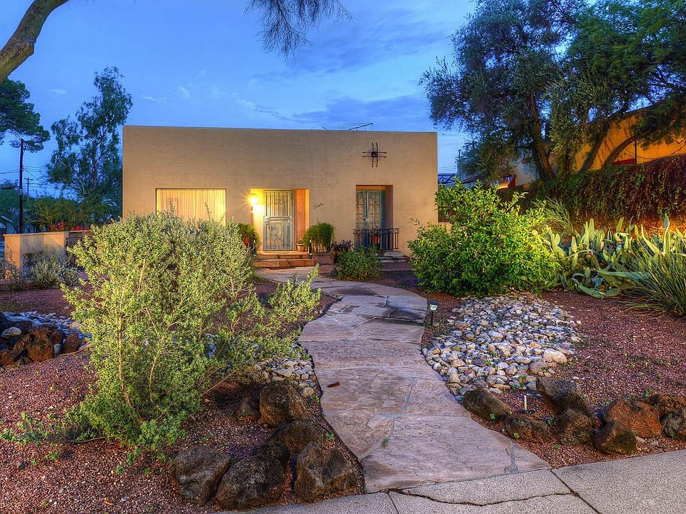 Sam Hughes 1919 home has coved ceilings, hardwood floors, 2 bedrooms & 1 bathroom downstairs, large living area with a fireplace, nichos, bright and light and freshly painted throughout the home, open kitchen separate dining room w/builtin from Old Cigar shop from 1880's downtown & an upstairs Master bedroom w/separate shower, clawfoot tub. Separate yoga room, plus a 1 bedroom guest house! 2 car garage in the heart of the neighborhood. Walking distance to the U of A, Himmel Park, Modern Street car! Property being sold as is!