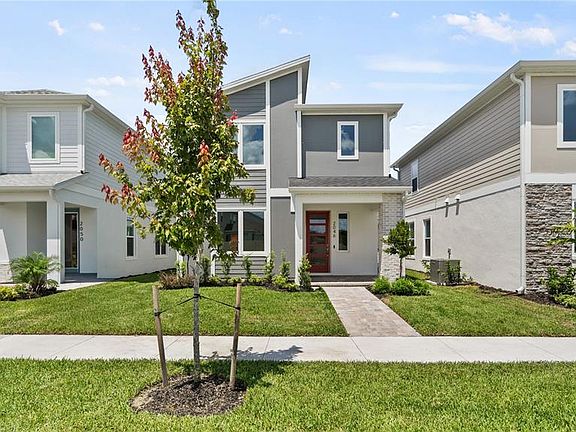 This brand new construction, two-story home (The Ambersweet) is a showstopper with the popular Modern exterior elevation. The home features 3 bedrooms, 2 full bathrooms, a powder room, and flex space all at 1,727 sq.ft. of living space. As you enter this home through the 8ft glass entry door, you are welcome with an open spacious foyer with immediate access to your flex space and a powder room with extra linen space. As you continue on you will find 12x24 ceramic tile flooring that leads you to the open-concept living room, dining room, and kitchen that's great for entertaining with a spacious eat-in island, a combination cooktop range, and a microwave all surrounded by quartz countertops and cabinets with a walk-in pantry featuring a sliding barn door. Moving to the second level, you have a split-level layout with the secondary bedrooms and guest bath on one end and the generously sized primary suite on the other end that accesses your private bathroom with a glass-enclosed free-standing shower, dual vanities, linen space and the water closet. Nearby to the primary suite is your walk-in laundry room. Trinity Place offers amenities, including a future Resort Style Community Pool with a Cabana Bath, a Tot Lot Playground, a Dog Park, recreational green space, and sidewalk trails throughout. Conveniently located near Downtown Saint Cloud, a Central Florida gem, you're just a short drive from Lake Nona Medical City, NeoCity, the up-and-coming SunBridge, and a stone's throw from Lakefront Park on the southern shore of East Lake Toho. Historic Downtown Saint Cloud, with its year-round festivals, shops, restaurants, parks, and excellent Osceola County Public Schools makes Trinity Place an excellent place to call home. *Photos may not be of actual home. Photos may be of similar home/floorplan if home is under construction or if this is a base price listing.