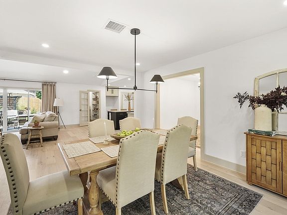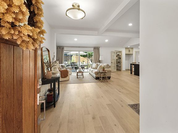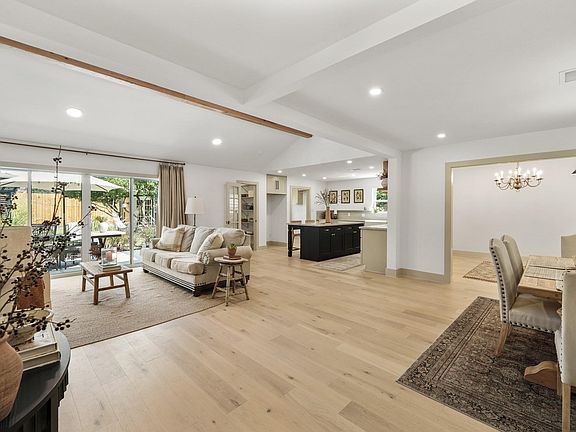 With European-inspired design elements throughout, this stunning one-of-a-kind remodeled home has been updated from the inside out. Removed & reconfigured walls showcase an open & airy floor plan with hardwoods throughout. Formal dining & study open to living room with oak beamed cathedral ceiling, 10 sliding glass doors, wood burning fireplace with custom mantel & shiplap accent wall. The thoughtful and well-planned kitchen features an island with breakfast bar, cabinetry highlighted by Quartzite counters & back splash, floating oak shelves, farmhouse sink, S/S appliances including 4-burner range w/pot filler, custom oak vent hood & walk-in pantry w/wine chiller, microwave and plenty of storage. Owners suite offers private access to patio & antiqued barn doors lead to luxurious bath with dual sink vanity, walk-in shower & closet. Secondary bedrooms have access to a second full bath & reading nook. Relaxing & serene backyard w/new 23x12 patio & pergola is perfect for entertaining!