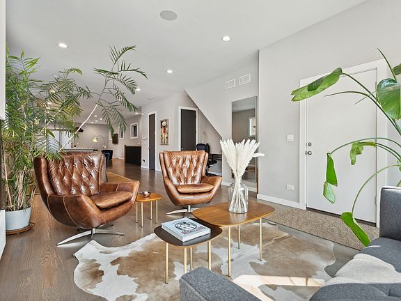 Experience unparalleled living in this spectacular sun-drenched, extra-wide duplex down developed by Halcyon Development. This spacious floorplan, which benefits from a wider layout than standard corner lots, features hardwood floors throughout, motorized window treatments in every room, wallpaper, a gourmet kitchen with high-end Viking/Bosch/Fisher+Paykel appliances, elegant quartz countertops, large island with additional storage, and wine/drink fridge. Enjoy 2 private outdoor spaces, with a serene back deck above the garage with custom pergola, outdoor tv, seating with a firepit, lounge chairs and dining room table perfect for grilling and entertaining outdoors. The lower-level houses all 3 bedrooms (all with custom closets) + a bonus room which can be built-out as a 4th bedroom or office. Large primary with custom walk-in closet, and marble bath has a double vanity, shower, tub, heated floors & towel rack. 2nd bath also features a double vanity and heated floors. Additional wet bar with fridge situated in bonus room provides a cozy den space. One garage spot included. Steps from Damen and Chicago Ave, Mariano's and all that East Village has to offer. The 2018 all-brick building is an amazing find and won't last long!