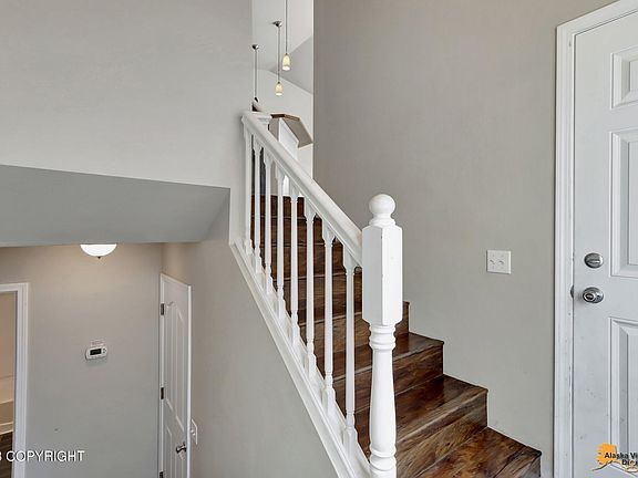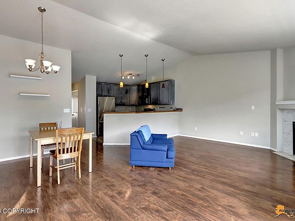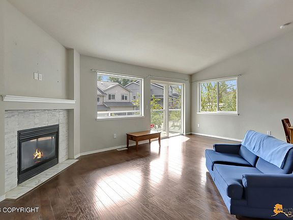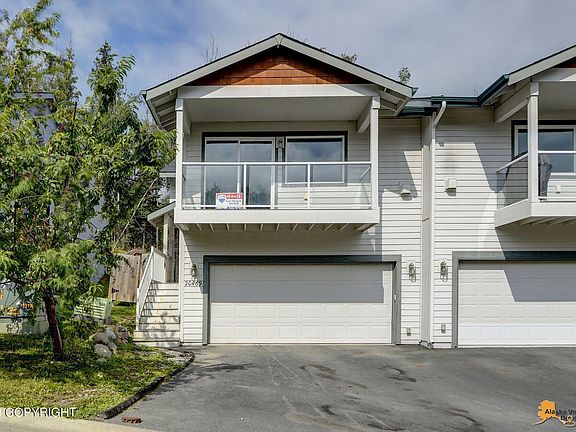 Beautiful townhouse-style condo with gorgeous mountain views! Kitchen with stainless steel appliances, breakfast bar and dining area. Open-concept living room with gas fireplace and slider to balcony. Master bedroom with walk-in closet and private bathroom. Two additional bedrooms and full bathroom downstairs. Two car garage. Excellent Eagle River location , quick commute to Anchorage and bases.