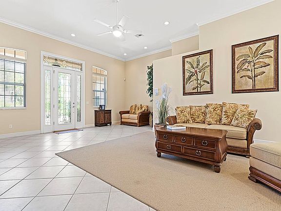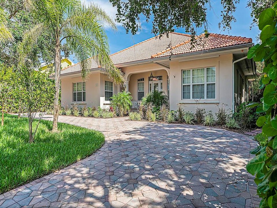 Beautiful 1-story CBS pool home w/4 beds & 3 baths, just steps to beach! Offered furn. Built in 2001. Tile & wood flooring thru-out. Marble wood-burning fireplace. Newer A/C's, water heater & pool pump. French doors lead to private fenced backyard w/pool/spa & oversized lanai. Southern exposure. Tile roof. Circular paver driveway. Storm panels. Low HOA fees! Sizes approx/subj to error.