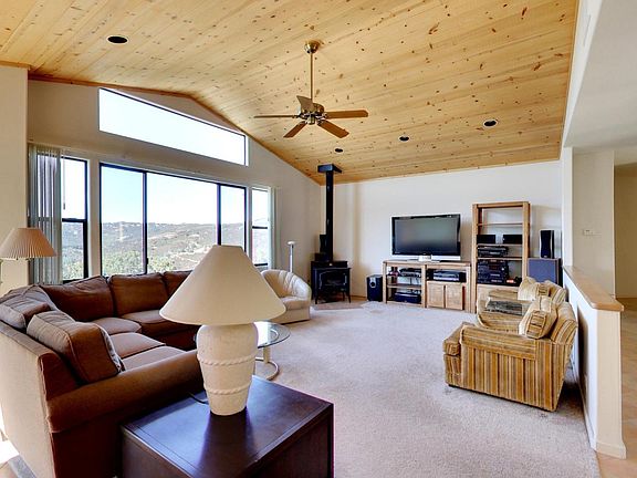 Spectacular million dollar views from every window. Gorgeous nightly sunsets year round seen from most rooms and decks all looking westward. 20+ acres at the top of the hill. Secure at the end of a private road with a locked gate. Rent paying caretaker can stay on. Spacious kitchen with a center island and lots of cabinets. 2 bedroom 2½ bath air conditioned main floor, business office, 8+ foot ceilings, vaulted ceiling in living room and large master bedroom suite. Huge master bathroom with 2 person Jacuzzi, large shower, dual vanities with sinks and a French door out to a deck with an outdoor bathtub and shower. 2 bedroom in-laws unit or part of the whole 4 bedroom, 3 ½ bath, + ½ bath on the deck. Separate driveway and entrance. Solar electric, water softener, 50 year roof, all appliances. Full kitchen cabinets in the 3+ car garage. Storage under home. Well ventilated and insulated. 2 whole house fans, 6 ceiling fans and 3 attic fans. Guest house blueprints.