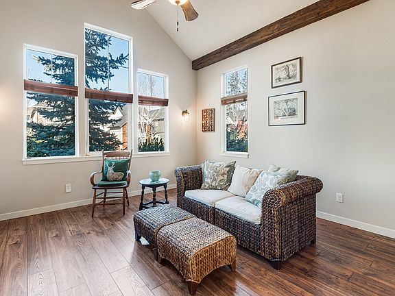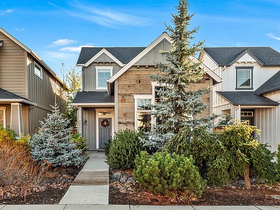 Live your fullest life in this beautiful Bend, Oregon home. The charming curb appeal is a neighborhood standout with a variety of mature trees to provide privacy yet allow an abundance of natural light. Beautiful finishes are apparent from the foyer's built-in corner benches to the custom beams accenting the living room's vaulted ceilings. The cozy centerpiece of the room is the barn wood fireplace with a sturdy hand-hewn mantel. The kitchen is in the heart of the home, featuring gorgeous cabinetry and island seating. Extend your conversation to the dining table or patio with ceiling fans to temper any hot summer nights. New carpet upstairs, where the primary suite enjoys a luxury bath with dual vanities, large walk-in closet and step-in shower. Two other bedrooms share a well-appointed full bath. Just 1.5 miles to the Old Mill District, this home is also conveniently within walking distance to Stone Creek Park, Silver Rail Elementary, and lovely trails along the canal.