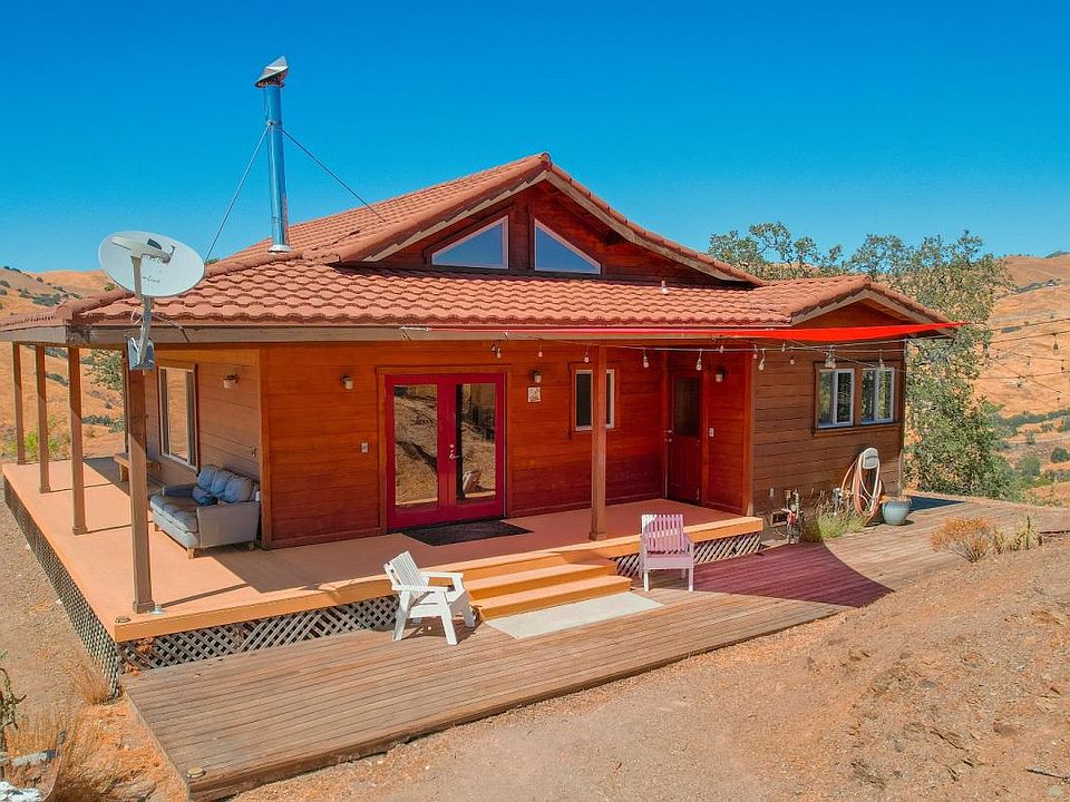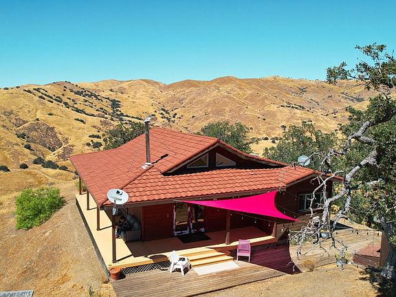 This is a beautifully built house located atop a hill on 38.4 acres in the central coast mountains of California with views of rolling hills dotted with Oak and Juniper trees, seasonal creeks, and grazing land. The exterior of the house is made up of redwood siding, and fire-resistant metal roofing, and is wrapped by a covered composite deck. The house offers two heating options, you can either use the wood-burning fireplace or the heated floors which are controlled by three different zoned thermostats. The house's 20 windows offer plenty of natural light and views in every direction. Being fully self-sufficient, the house is powered by solar panels that charge eight large batteries that offer 25kw of power storage. The house has both a solar water heater for efficiency and a tankless gas water heater for dependability. The property's water is supplied by its well and is stored in three 5,000-gallon tanks. All the utilities for the house are in a detached utility shed.