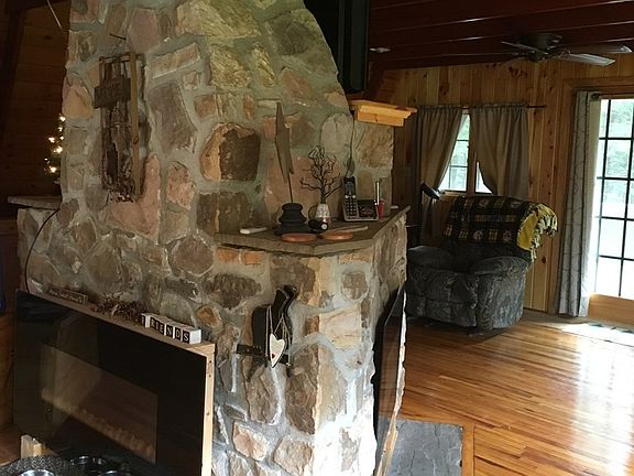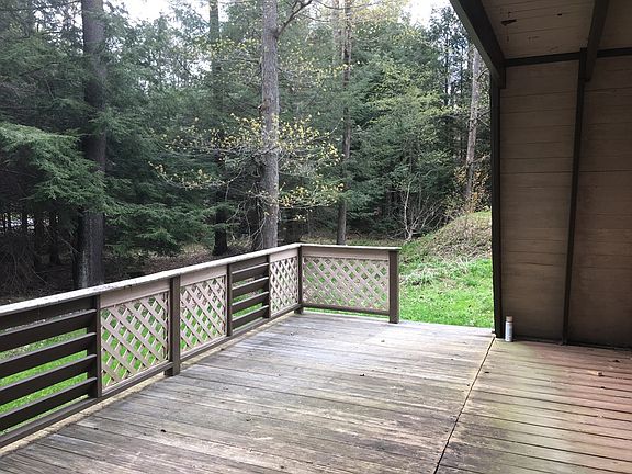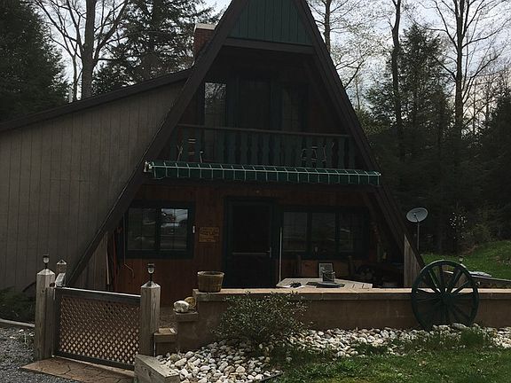 A MUST SEE! This is currently a lovely well kept seasonal property. It is a beautiful AFrame with tasteful additions. It has a three sided fireplace with three electric screened fires. Very nice hardwood floors on the first floor. Features a large open kitchen/dining, living room area. Along with the 1st floor bath. The second floor has two very nice size bedrooms, each with their own private balcony. The basement has a bedroom and bath and a large room with many possibilities. The basement also houses the utility area. The outside area has a large open front deck. The rear of the cabin has a large patio area that features an electric "Sun downer" awning...perfect for entertaining. The pond has a large amount of fish...that will gather to be feed! Two small storage sheds for those outdoor tools. The second bldg is a great entertaining feature with water, heat and wood stove. . Private drive, seclusion, privacy yet conveniently located with 1200+' Rt 6 road frontage.