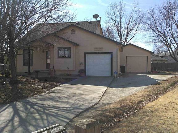 Very special home with a rare floorplan. Much larger than it appears from the curb. Goddard School District! This home features two bedrooms on the main level and a large loft with a half bath on the upper level. There's an attached one car garage and an additional detached oversized one car garage that has a roughed in bath (not included in total bath count). RV parking on the side of the detached garage with electrical hookups and RV clean out. The basement is large and has one bonus room, a wet bar, and bath with a shower. Updates include furnace from 2011, Dishwasher and disposal 2015, ADT proprietary alarm system, wet bar plumbing 2011, kitchen floor 2009, rooms painted 2015, and roof 2014. This home is on a quiet cul de sac with friendly neighbors. This home is a must see!