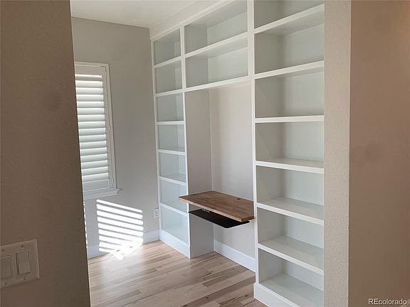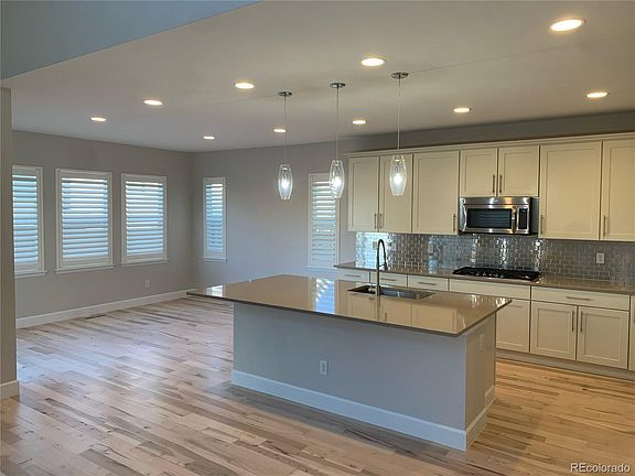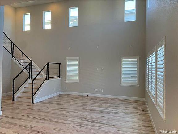 Like new home with multiple custom features including: custom steel and cable stair rail; solid natural maple floors covering the entire main level, upper and lower stairs, and workout area (newly refinished); new interior paint, contemporary shutters; tile in all baths, mudroom and laundry; quartz counters and under mount sinks. Light filled great room with large windows and dramatic two story ceilings. Great room flows to open and spacious kitchen with oversized island, stainless steel double ovens, gas cook top, oversize steel sink maple cabinets and stainless back splash. Kitchen and dining open up to a Trex deck and lower patio, with low maintenance landscape. Other special features include two laundry facilities (upper and lower levels); 5 1/4" baseboard trim; primary bedroom with en suite bath, walk-in closet and built-in cabinets; fully finished garden level with rec room, bedroom with en suite bathroom and private laundry; workout area and beverage center. Built in bookshelves and desk in the study and built-in storage cubbies in the mudroom maximize storage. Over-sized two car garage with built-in storage; and oversize driveway, with sidewalk leading to back yard. This home is located on a cul-de-sac and is designed to be low maintenance, with artificial turf, perennials, grasses, shrubs and trees that require very little time and effort to maintain. Gas line is run for option to add great room fireplace and outdoor grill. New roof in 2020. Neighborhood access to the Cherry Creek Regional Trail. elementary school, parks, tennis court, two pools, and dog park, in neighborhood.