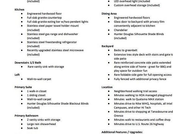 Impeccably maintained gem, light & bright backing to greenbelt. Near Nike, Intel, shopping, restaurants, hospitals, light rail station & more! Loaded w/upgrades & customized features including bedroom suit w/2 closets & soak tub, upper level loft/fam rm area, upgraded lighting, shelves/built-ins & fully finished garage w/custom storage racks, LED lights & epoxy floor. Extra parking! Deck runs across entire backyard w/gated stairs to extensive patio & fenced yard backing to green space/trails.