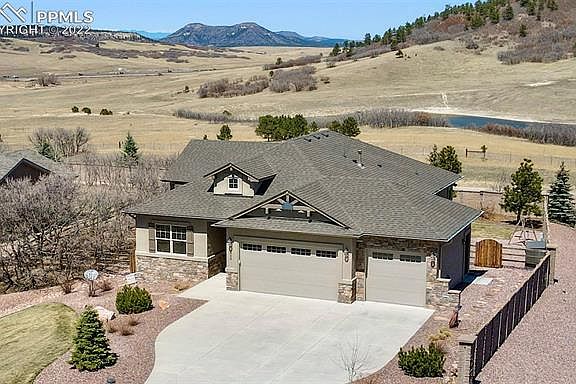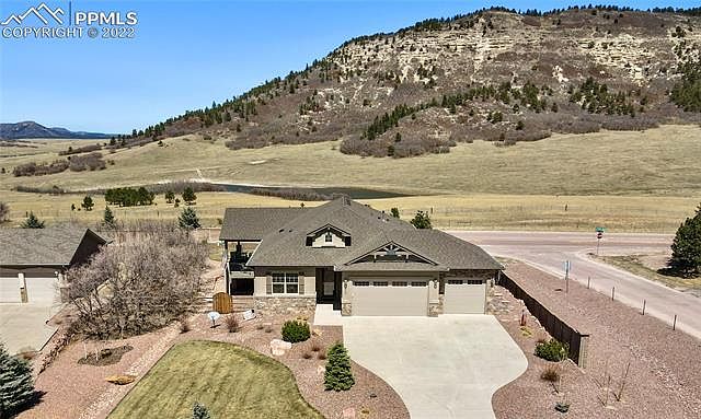 Truly Exquisite ~ Fine Custom Craftsmanship in this Willow Model by Jayden Homes. .53 Acre lot with views of Pikes Peak, Palmer Divide, Greenland Ranch, and colorful sunsets. Backs to 21,000 acres of protected open space. Unobstructed views of Bald Mountain, mesas, bluffs, graceful rolling hills, meadows and ponds. Enjoy the view, as well as the wildlife! Herds of elk often graze morning and evening. Higher-end features are plentiful; 2X6 Construction, high-def roof (cat 4), tongue & groove covered entry and deck, composite deck w/metal railing, dual zoned HVAC, stunning paneled entry, solid alder 8 doors, base trim, window sills, fine-furniture quality soft close cabinetry, wood floors w/dual stain, coffered ceilings, crown molding, and 240V 50amp (for temp RV or generator). Views line the Great Room with a gas fireplace, surrounded by floor to ceiling stone masonry, open to the kitchen, dining area and deck. Kitchen amenities include; Crown & light rail trim, counter to ceiling wall tiles, 5 burner gas range, electric convection wall oven, walk-in pantry, and a central island with bead board paneling. The Primary Bedroom has full views and 5-pc Bath; Walk-in shower, built-in bench, infinity drain, soaking tub, water closet, and mixing-valve to customize hot water to fixtures. The walk-in closet accesses the Laundry Room, complete with a sink, counter and cabinets. Living space continues in the bright garden level basement; Large Recreation Room and Bedrooms w/walk-in closets, and approx 375 SF of Storage. Upgrades continue to the oversized 681 SF heated Garage; Fully finished (insulated, textured, painted), well lit, 12.5KW heater, 23 deep double bay, 21 deep single bay, 8 header height with insulated overhead doors. Landscaping includes; 240V 50amp outlet, 240V 70 amp sub panel, hot tub pre-wire, deck stair lighting, lawn outlets for holiday/accent lights, solar lights line fence, pre-plumbed water feature, 4 spigots, and buried downspouts to French drains.