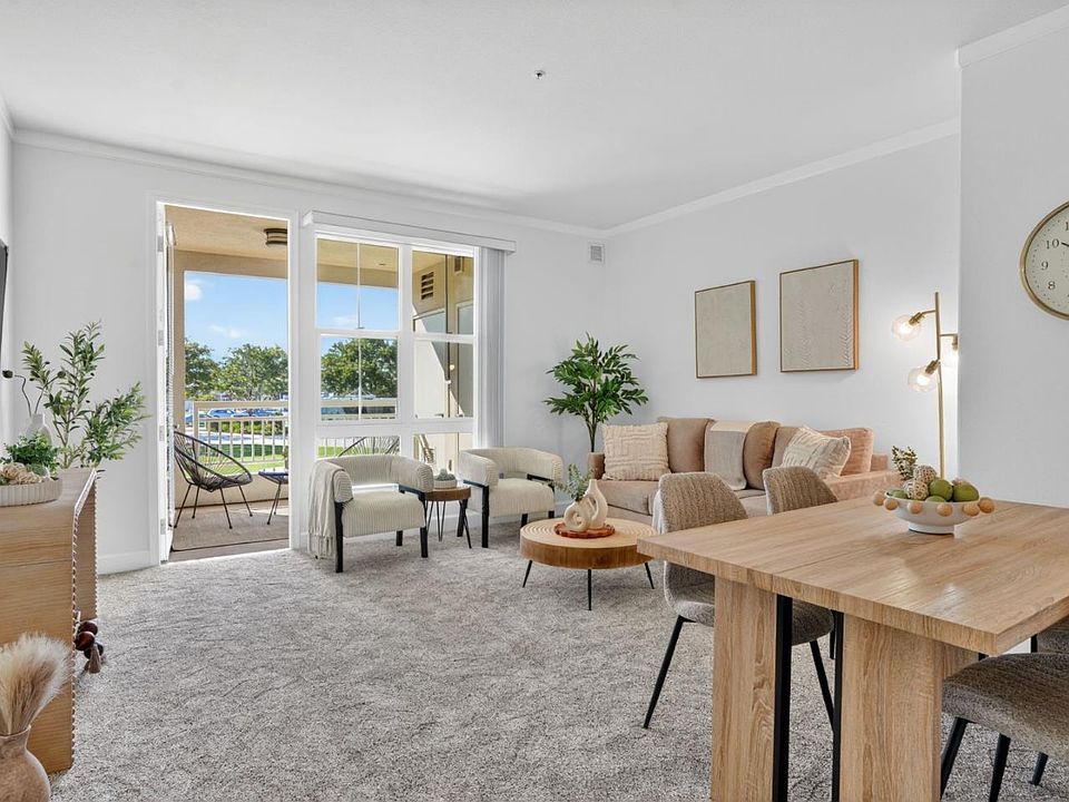 Bright, Move-In 1BR Condo Steps to Cupertino Retail & Transit, Private Balcony + In-Unit Laundry. Ideal for a tech professional or downsizer who wants turnkey living close to major employers, transit, and shopping. Tucked within a lush, park-like setting, this move-in-ready second-floor home is bright, airy, and beautifully updated. Fresh paint and pristine carpeting create a welcoming feel throughout the open-concept layout. The floor plan thoughtfully includes a versatile den that can serve as a home office or guest retreat, a chic kitchen with gleaming quartz countertops, and a spacious bedroom featuring a generous closet.