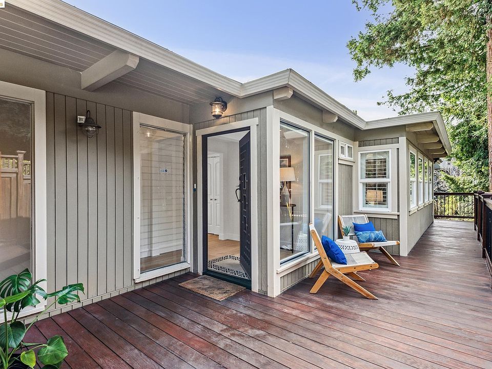 Welcome to 2049 Magellan Drive, a beautifully remodeled oasis in the Montclair neighborhood of Oakland. This stunning home offers 4 bedrooms, 3.5 bathrooms, and a total of 2742 square feet of living space, situated on a spacious 10,692 square foot lot. The main level, with no-steps-to-entry, features a bedroom suite with its own private entrance. As well as the kitchen, living and dining rooms, plus powder room, all with an abundance of natural light and large windows, creating a serene ambiance and a seamless connection to the surrounding nature. The lower level boasts three bedrooms, including a luxurious primary en-suite with a spa-like bathroom featuring a soaking tub and high-end finishes. Plus large walk-in, custom closet and separate seating area provide a private retreat within the home. Comfort is assured with a new, high-insulation roof & a/c, while beautiful hardwood flooring adds a touch of elegance throughout. Notable amenities include a fireplace, large garage, and multiple decks, perfect for relaxing and entertaining. The property is sewer lateral compliant, sidewalk exempt, with a very low Section 1, making it an ideal choice for discerning buyers. Don't miss the opportunity to own this meticulously improved home, where every detail has been tended.