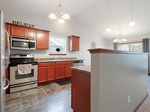 Super clean & move-in ready ranch with walkout lower level! This home will impress throughout and features a spacious, open layout with vaulted ceilings, gas fireplace in the living room, and a big kitchen with island & breakfast bar. Perfect time to snag this home and enjoy spring buds on the trees in the wooded area out back. Two spacious decks and a concrete patio for bird & wildlife watching...and entertaining & grilling! Other great features are master suite with full bath & walk in closet, main floor laundry (washer & dryer included), fully finished lower level with wet bar & rec room, and 2 car garage. Great layout with a bedroom up front and the master at back of the house, plus large bedroom in lower level. Awesome neighborhood tucked in the hills near Ellis Golf Course. Convenient, yet quiet & wooded.