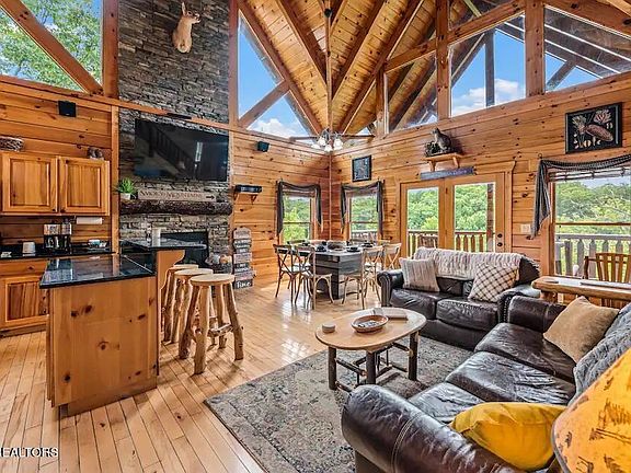 Escape to your own slice of mountain paradise to this stunning mountain log cabin nestled in Gatlinburg, conveniently close to popular attractions. Boasting breathtaking views and surrounded by nature's beauty, this cabin offers the perfect retreat from the hustle and bustle of everyday life. Relax in the cozy living room, where a 65'' Roku Smart TV and Bluetooth surround system offer entertainment options. Step outside to the expansive decks for outdoor living at its finest, with seating areas, a hot tub, and a porch swing for enjoying the serene surroundings. The decks are the ideal spot for enjoying your morning coffee or stargazing under the night sky. The main floor showcases a spacious great room and kitchen, complete with rustic yet refined furnishings and a double-height vaulted ceiling. The well-equipped kitchen boasts stainless steel appliances and ample seating for dining. The cabin features three king-size bedrooms, each with ensuite bathrooms equipped with a bathtub/shower combo and 55'' Smart TVs for your entertainment. For maximum privacy, the Primary Suite occupies the entire third level and boasts a jetted tub right in the bedroom with breath-taking views! The second bedroom on the main floor is perfect for families, with a king bed and a double bed futon, ideal for two children. Its dual-entry bathroom ensures convenience and privacy. On the lower level, the third bedroom across from the game room offers flexibility and comfort, with dual-entry bathroom access and serene woodland views. The game room is a haven for entertainment, with bunk beds, a brand-new queen futon, a full-size pool table, a multi-game arcade, and more. Gather for family fun or cozy up by the gas fireplace on chilly evenings. Indulge in the ultimate relaxation with a soak in the hot tub or jetted tubs, all while soaking in the scenic mountain views from the two spacious decks, offering glimpses of Clingmans Dome. Warm up by the cozy gas fireplaces, or challenge friends and family to a game in the inviting game room. This cabin is EV-ready, featuring an OK2Charge Level 2 Smart EV Charger*, ensuring convenience for electric vehicle owners. Grill out on the charcoal grill and perhaps catch a glimpse of wildlife while cooking. After a day of adventure, retreat to this tranquil haven where relaxation and luxury await. Conveniently located near hiking trails, fishing streams, and all the attractions of Gatlinburg and Pigeon Forge, this cabin offers endless opportunities for outdoor recreation and entertainment. Please note that the community pool is currently closed due to renovations. Don't miss your chance to own your own piece of mountain paradise. Schedule your showing today and start living the mountain lifestyle you've always dreamed of. OUTSTANDING RENTAL HISTORY - 2023 Grossed - $126,929.19 and in 2022, the cabin started rentals on 09/28/22 and grossed $43,954.72.