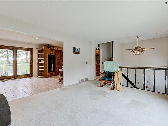 Right outside town with great views, and low county taxes. Nice big living room. Kitchen has tile floors, large breakfast bar, dining area, and all appliances remaining. Primary bedroom has a walk-in closet and 3/4 bath. You can step out onto your deck and patio to relax and enjoy the quiet here. New seamless siding with transferable warranty. Leaf guards. Newer Anderson windows. Full finished basement offers a large family room w/ gas fireplace, and a 3/4 bath. Washer and dryer also will stay. Attached heated 2 car garage, plus there is another pad poured to store your camper (30 amp hookup on side of the house for camper). Shed out back has electric and all LED lighting.