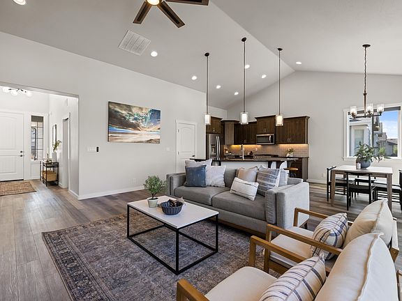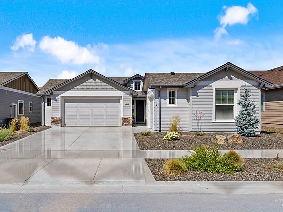Meticulously maintained & impeccably cared for single-level residence situated in the desired foothills just above Boise. Generously upgraded "Western Yarrow" design offers a split-bedroom floor plan, private guest quarters & an open great room concept. Be greeted with an elegant entrance of handcrafted custom woodwork, vaulted ceilings, and engineered wood floors spanning from the foyer into the great room. Timeless gourmet kitchen features an extended slab granite island and generous walk in pantry. Upgraded third car garage bay option makes the perfect mini shop. Escape to privacy and seclusion in the background oasis complete with a covered patio, privacy fence, and sun shade.