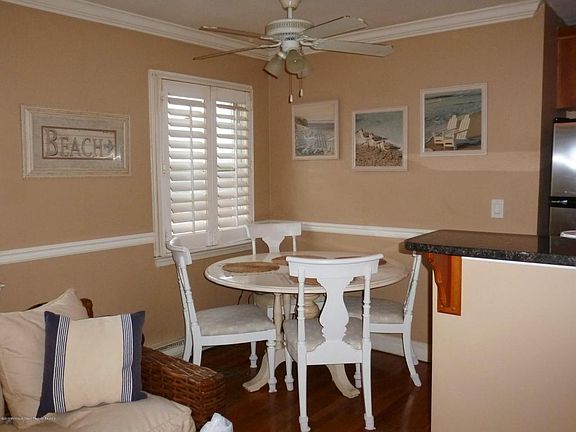 Rare 2 bedroom condo located in the desirable and quiet north end of Belmar. 1 block to a magnificent ocean beach and outstanding boardwalk. Totally renovated upper level condo features an open floor plan with 2 large bedrooms. Beautiful kitchen has Shaker cabinets, stainless appliances and granite counters. Hardwood floors, crown moldings, and custom plantation shutters. Washer and dryer in unit. Private storage bin on the first level for beach chairs, umbrellas, etc. Assigned parking space. Desired Harbour Sands condo complex has impressive air controlled entry hallways. Short 2 block walk to great fishing on the Shark River Inlet. No flood insurance required.