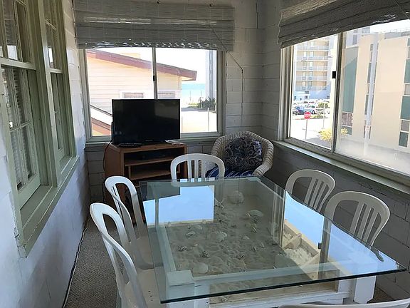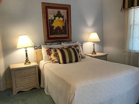 Located in the White House, the Charles Suite offers a comfortable winter stay with plenty of charm. This cottage apartment features two private bedrooms, each with a double bed, and a dining room with seating for four. The highlight of the suite is its spacious enclosed wraparound porch, complete with a sofa, television, table, and two daybeds perfect for relaxing with a view of the Virginia Beach boardwalk.