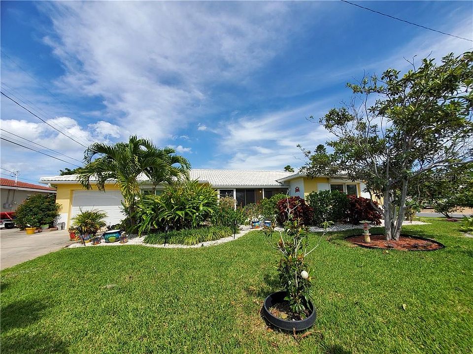 Visualize yourself in this corner lot tropical oasis with just a short walk from the desirable St Pete Beach! This festive home has spacious living & family areas, light and bright bedrooms, large eat in kitchen, well maintained gardens, variety of fruit trees, butterfly garden sanctuary. Enclosed lanai, relaxing screened front porch, garage with extra storage, newer electrical panel and updated energy saving hurricane windows. Tile roof is 15 years old and newer A/C installed in 2017! Living, dining and family room areas. Located in a quaint neighborhood just footsteps away from restaurants and shopping. Come see how adorably amazing this home truly is! Please go to stpetebeach.org to see all codes, zoning, and rental policies for the area.
