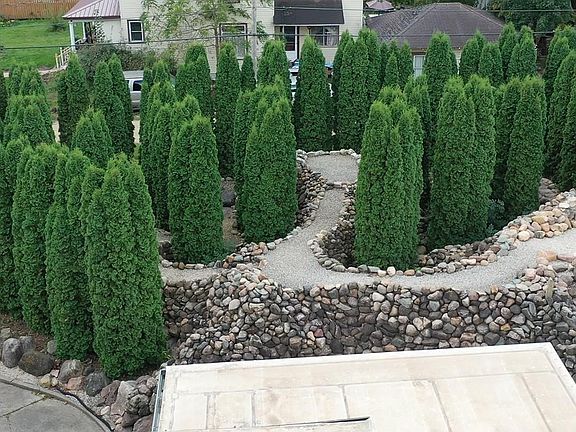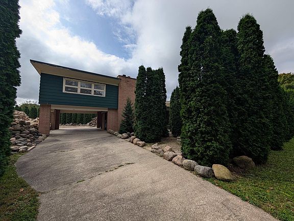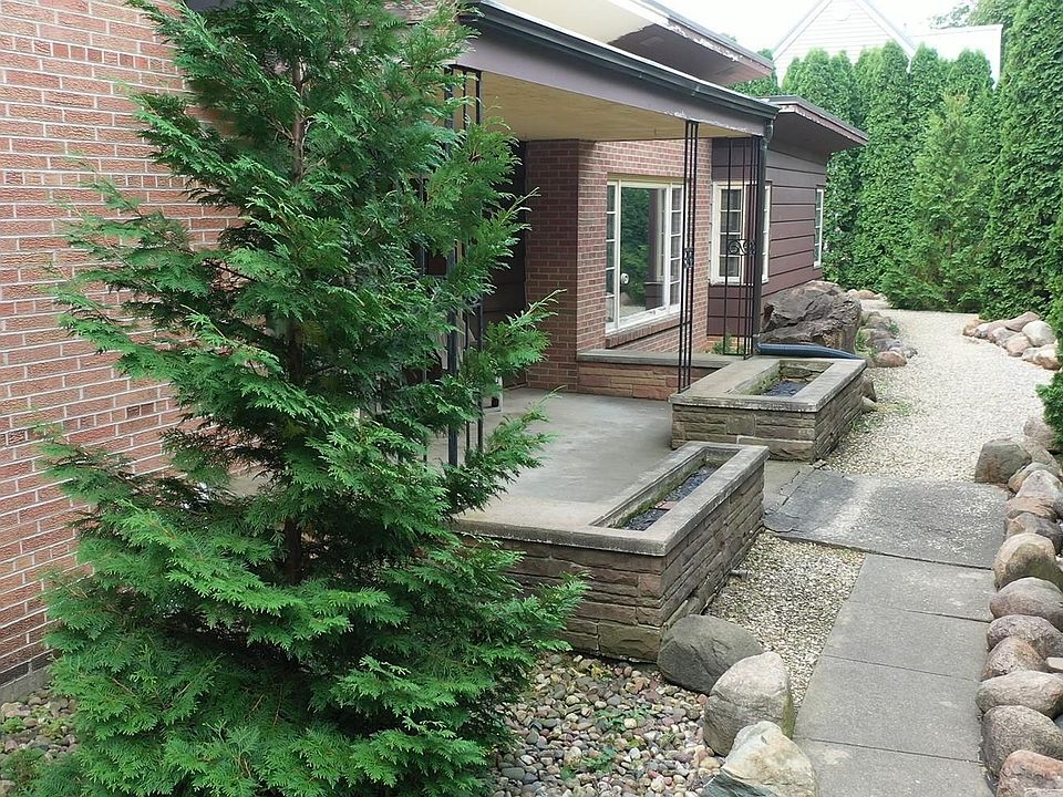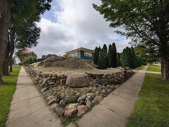 Well preserved example of early architecture in the manner of Frank Lloyd Wright. Family home of renowned Iowa architect George R. Laub, designed in 1952 and constructed in 1953. The exterior is a marvelous mélange of materials: Mankato marble, Norman brick and 12” cedar. The roof is an imaginative interplay of 5 gently sloping elevations supported by 2” X 12” rafters with wide upswept eves and 60-mil rubberized membrane installed in 2009. The interior is even more fanciful, with marble and brick walls and columns, paneled and parqueted walls, with accents of quarry tile, wrought iron and decorative glass. 3,122 sq. ft. of living space with three bedrooms and two and a half baths plus a potential fourth bedroom or recreational room above the carport. Incorporated into the design, in every room, built-ins are the rule: bookshelves, radio, phonograph and record storage in the living room; buffet and wall-mounted display case in the dining room; bookshelves, desk, filing cabinet and safe in the den; dressers, vanities, even a display case in one bedroom, and a headboard in another; telephone desk in the kitchen; and a bench and storage cabinet in the foyer. Heat is provided through the concealed in-ceiling hot water radiant loops and a high-efficiency four zone gas-fired boiler. The innovative architecture of the home is complimented by imaginative landscaping of a 150’ X 150’ corner lot. Some 4,000 tons of glacial rock, from multi-ton boulders to baseball sized agates, are artistically arranged to form a sprawling rock sculpture, with undulating elevations replete with serpentine walkways and staircases. The plantation of pyramidal arborvitaes, now 18’ to 20’ tall, add an accent of greenery and provide unparalleled privacy and seclusion. The result is a spectacular natural wonderland surrounding the property known locally as “The House in the Rocks” Laub’s pen and ink frontispiece renderings of the north, south and east elevations, along with the original building plans, including electrical and plumbing schematics, will convey to the buyer, an unexpected and invaluable bonus.