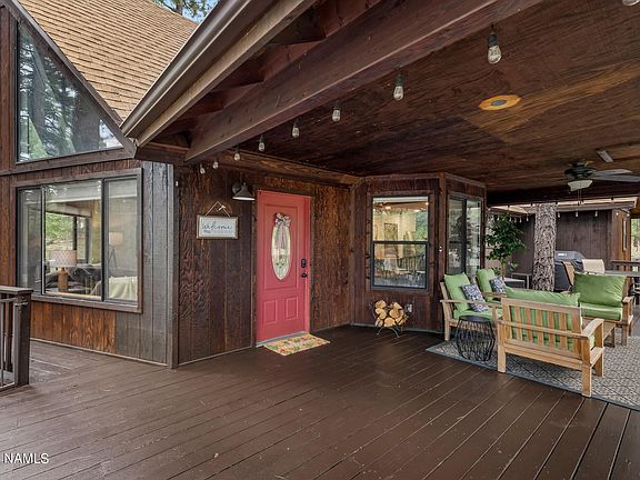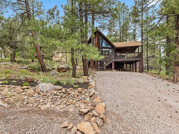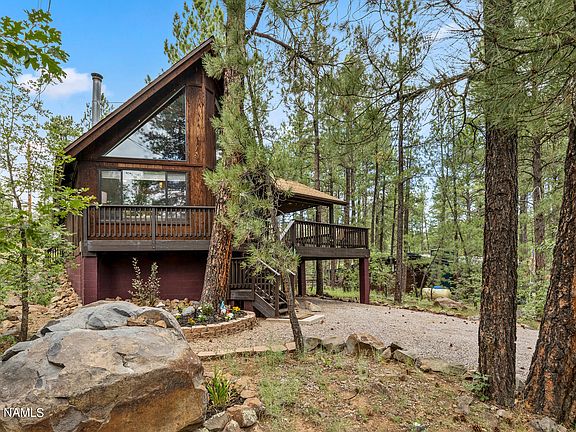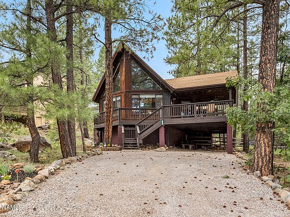 Light and bright with windows everywhere. This two bedroom chalet has a spacious loft that functions as a third bedroom. The location is perfect as it's perched above and back from the street allowing views and privacy. There is a large amount of deck space both covered and uncovered for summer living and outdoor entertaining. Inside, the great room has soaring T&G ceilings, a wood burning stove and an open and inviting feel. There's a generous sized living area, separate dining area nook, and an open kitchen with an island and breakfast bar. Stainless appliances, a coffee/liquor bar and two pantries too. The primary, second bedroom and two baths are on the main floor. The backyard is fenced and the yard is landscaped with a watering system. Central HEAT and AIR CONDITIONING. Furniture is negotiable.