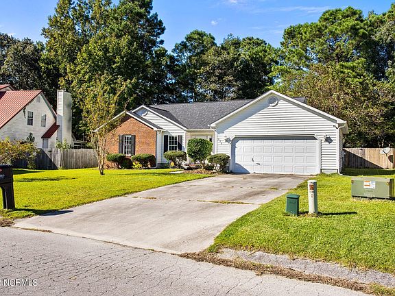 Come see this 3-bedroom, 2-bathroom, 2-car garage home located in the Hunters Creek subdivision. The home has NO HOA and is located outside of city limits so NO CITY TAXES either. It is on a sewer system so no septic with this one. The home features a large living area with vaulted ceiling and an adjacent dining area/flex room with a wood-burning fireplace. There is also an additional room off the dining area that could be used as a small office or additional storage. The kitchen and eat-in nook are combined providing ample space for the chef on the family. The primary owner's suite is on the right side of the home while the two guest bedrooms are on the left, providing for additional privacy. The backyard is fully fenced and has an inviting covered deck. Located about 5 minutes from Camp Lejeune, shopping, and restaurants. Come see this one today before it's going, going, gone!