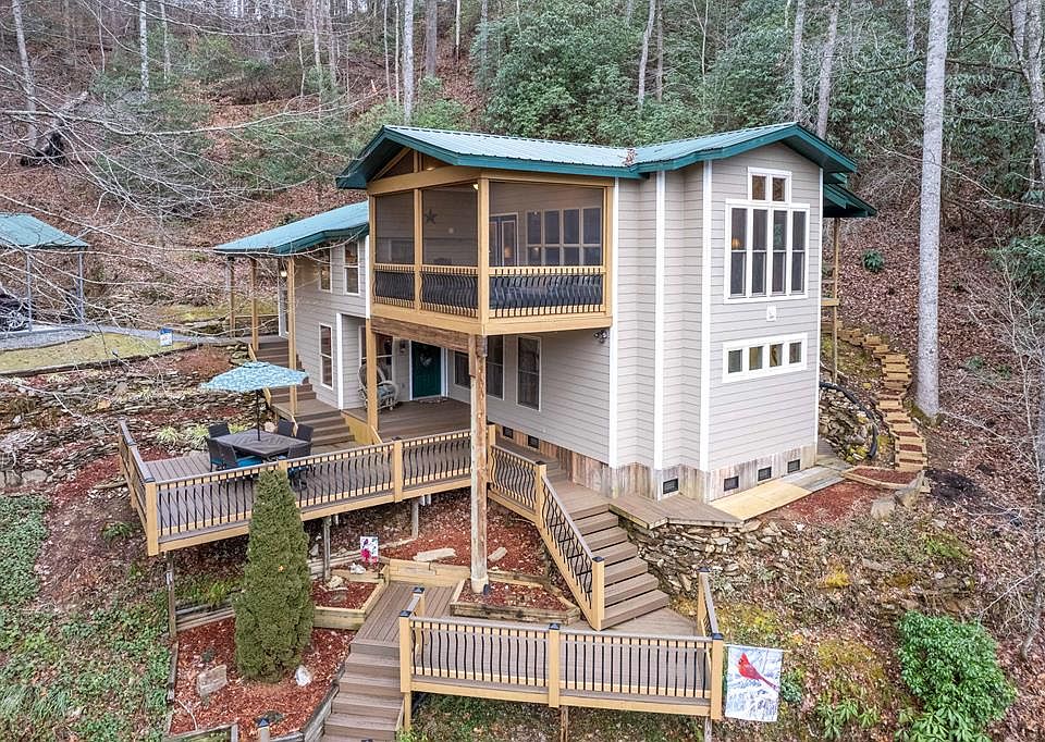 Treehouse living in this beautiful 2 bedroom/2 bathroom updated home in a lovely setting just minutes from Dillsboro, Sylva, Cherokee & Bryson City. Upper level boasts a great room with cathedral Tongue & Groove ceiling and lots of windows for natural light & mountain views, spacious screened porch, updated kitchen with lots of cabinets, guest bedroom, full bathroom. Bonus room provides the perfect reading nook, office , etc! Lower level offers a primary bedroom with a large modern ceramic tile bathroom! Lower level opens to additional decking! (Trex) Property is beautifully landscaped with little minimal yard work required, a workshop and a 2 vehicle carport. Don't miss out on this captivating home! Schedule your private showing today!